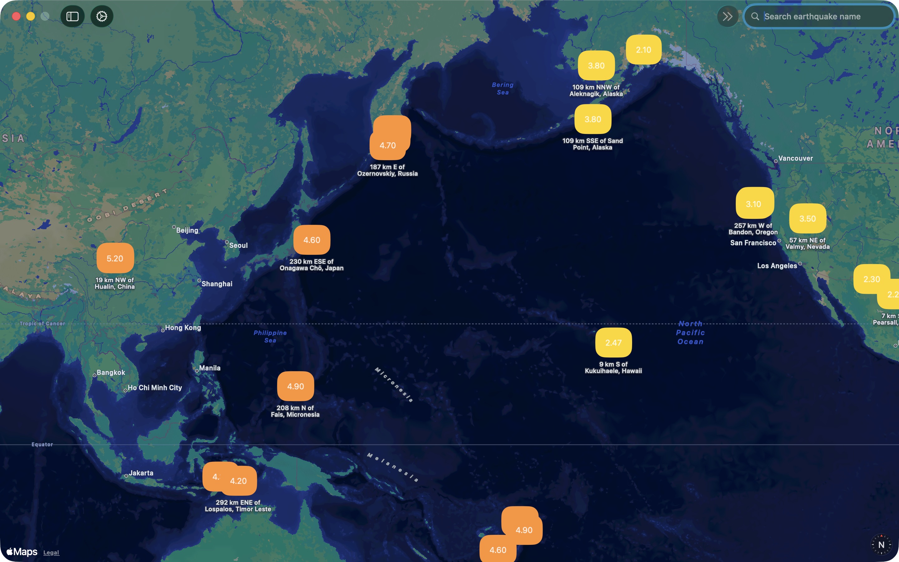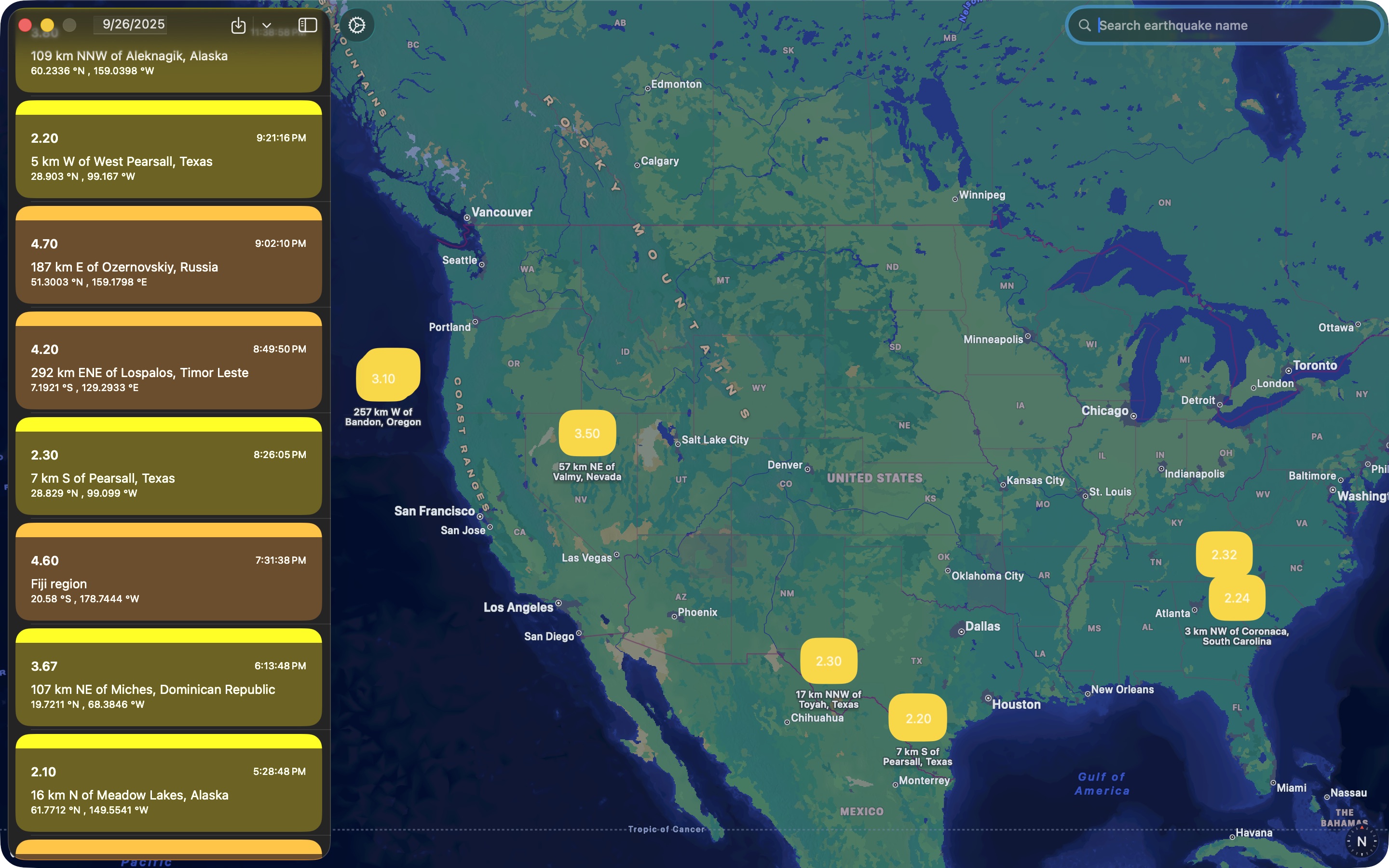 Supports importing USGS hour, day, and week feeds. Earthquake data is synchronized across supported devices where available.
